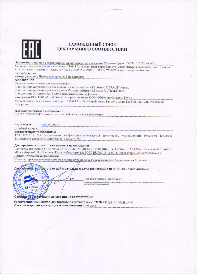Подробнее: Все компоненты, входящие в состав Геля ULTRALIF "Ультралифтинг" женский, обладают двумя факторами или свойствами: Рассмотрим более подробно все компоненты, входящие в состав геля: Arteskin® - уникальный экстракт из цист Артемии, который наполняет кожу энергией, защищает от вредного воздействия окружающей среды и усиливает ее восстановление. Arteskin® относится к активным веществам, создающим уникальные условия для самовосстановления кожи и уменьшения видимых признаков возрастных изменений, является источником высокоэнергетических соединений GTG (дигуанозинтетрафосфата), HSP (белков теплового шока) и других веществ (пуриновых, пиримидиновых оснований), участвующих в построении клеточных структур; Arteskin® превосходно увлажняет кожу и защищает от повреждающего действия свободных радикалов, стимулирует обмен веществ, увеличивает синтез коллагена, что приводит к укреплению структуры кожи, повышению ее упругости и уменьшению глубины морщин. Клеточный активатор и восстановитель Arteskin®, усиливающий синтез АМФ in-vitro: Описание: Arteskin® - активный ингредиент для косметики, полученный экстракцией цист Artemia Salina. Создан для восстановления кожи и как источник дополнительной энергии, показывает множественный защитный эффект: HSP® - белки теплового шока (шапероны), присутствующие в клетках всех без исключения организмов, сглаживают последствия стрессовых воздействий на клетки. Шапероны охотно вступают во взаимодействие с самыми разными пептидами и несут на себе «антигенный отпечаток» каждой клетки. Благодаря этому они принимают непосредственное участие в активации иммунной системы. HSP – играют ключевую роль в функционировании биологических систем всех уровней – от отдельных клеток до организмов и даже целых популяций. Эти вездесущие белки являются самыми древними и консервативными среди всех белков. Считается даже, что они в какой-то степени руководят эволюционными процессами. Образуясь в условиях стресса (в частности, при повышении температуры), HSP помогают клеткам поддерживать в рабочем состоянии все механизмы и избегать гибели. Десять лет назад биологи обнаружили, что у высших организмов, в том числе у человека, HSP выполняют и другие важные функции. Они участвуют в работе иммунной системы, защищая организм от патогенов, и в то же время предотвращают апоптоз раковых клеток. Белки теплового шока функционируют и в клетках, находящихся в обычных условиях. Но насколько возрастает их роль, когда ситуация меняется? В экстремальных условиях – при очень высоких либо при очень низких температурах, кислородном голодании, дефиците воды и питательных веществ – клетка бросает все силы на то, чтобы выжить, и шапероны смягчают последствия стресса, спасая жизненно важные белки, демонтируя безнадежно поврежденные и повторно используя их компоненты. Происхождение: Artemia Salina – нектон, живущий в озерах с повышенным содержанием солей. Цисты Artemia Salina способны долго сохранять жизнеспособность и выдерживать высыхание и экстремально низкие и высокие температуры. Когда условия окружающей среды становятся критическими для жизни, цисты впадают в анабиоз, инкапсулируются и аккумулируют жизненно необходимую молекулу GTG® дигуанозинтетрафосфат (Diguanosine Tetraphosphate) - главный источник фосфатных связей с высоким энергетическим потенциалом, который защищает ДН
