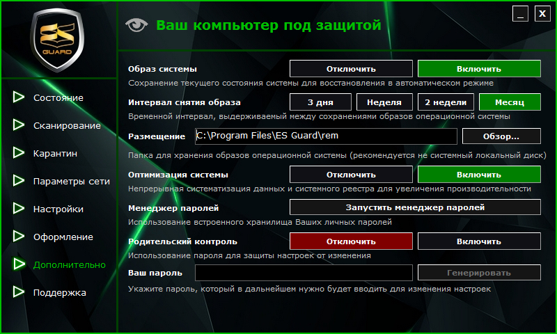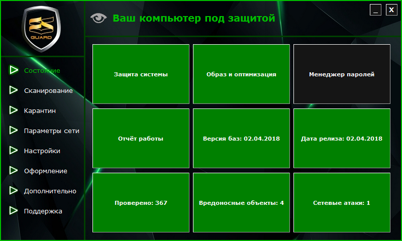 Скачать программу (в файле находится бесплатная версия на 45 дней) После покупки программы на электронную почту будет выслан ключ активации соответствующей версии Рекомендуется: Система безопасности ES Guard работает по следующим принципам: Основные функции: Антивирусная защита - осуществляет постоянную проверку системного реестра на предмет несанкционированных изменений критически важных параметров. Файловый антивирус - проверяет все исполняемые файлы на наличие вредоносного кода и подозрительных изменений, предотвращает попадание на территорию системы троянских коней, червей, рекламного ПО, программ-шуток и другого целенаправленно написанного и потенциально нежелательного контента. Сетевой экран - осуществляет защиту от непредвиденных внешних подключений к Вашему компьютеру, блокирует хакерские атаки. Контроль трафика - осуществляет проверку информационных потоков при подключении к сети Интернет на предмет наличия вирусов и вредоносного кода (в расширенной и профессиональной версиях). Повышение производительности - постоянно проверяет системный реестр и временные файлы на наличие неправильных или неиспользуемых записей для их дальнейшей ликвидации (в профессиональной версии). Образ системы - в случае отказа операционной системы позволяет восстановить её в исходное состояние (в профессиональной версии). Менеджер паролей - надежное хранилище для Ваших паролей в едином сегменте, защищенном оригинальным алгоритмом. |
